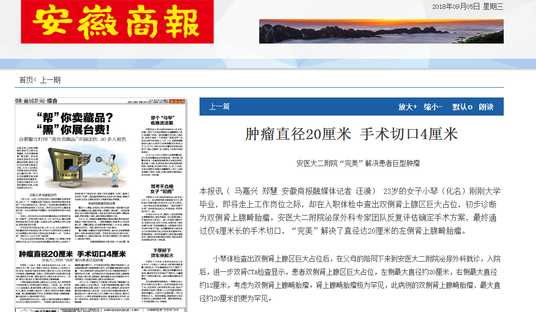 本报讯( 马嘉兴 郑慧 安徽商报融媒体记者 汪漪) 23岁的女子小琴(化名)刚刚大学毕业,即将走上工作岗位之际,却在入职体检中查出双侧肾上腺区巨大占位,初步诊断为双侧肾上腺畸胎瘤。安医大二附院泌尿外科专家团队反复评估确定手术方案,最终通过仅4厘米长的手术切口,“完美”解决了直径达20厘米的左侧肾上腺畸胎瘤。
