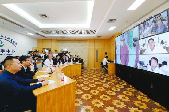 图为在安医大二附院远程医学中心,现场专家根据石台县医院的实时手术影像进行指导。