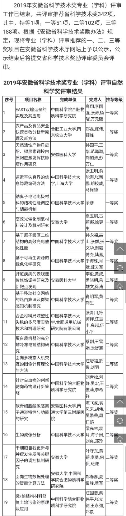 2019年安徽省科学技术奖专业(学科)评审工作已结束,共评审推荐省科学技术奖342项,其中,特等1项,一等51项,二等102项,三等188项。根据《安徽省科学技术奖励办法》规定,现将专业(学科)评审推荐的一、二、三等奖项目在安徽省科学技术厅网站上予以公示,公示结束后将提交省科学技术奖励评审委员会评审。