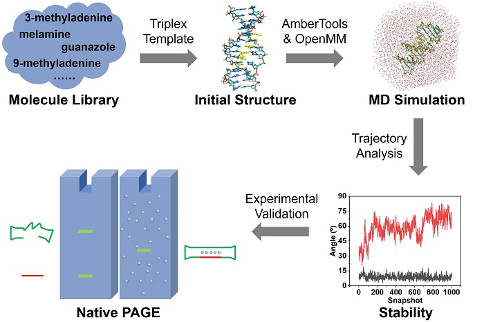 该项研究采用分子动力学模拟与实验协作的新方法加速筛选了DNA碱基-有机小分子相互作用结构。在首批研究的38个小分子中,有多个小分子能够识别DNA碱基并形成DNA碱基-有机小分子相互作用结构,其中包括抗肿瘤小分子药物氟达拉滨、抗真菌药物西奈芬净、自噬抑制剂3-甲基腺嘌呤、免疫调节剂虫草素等。这些新发现有望为合成小分子药物递送载体、实现临床精准治疗提供新策略。
