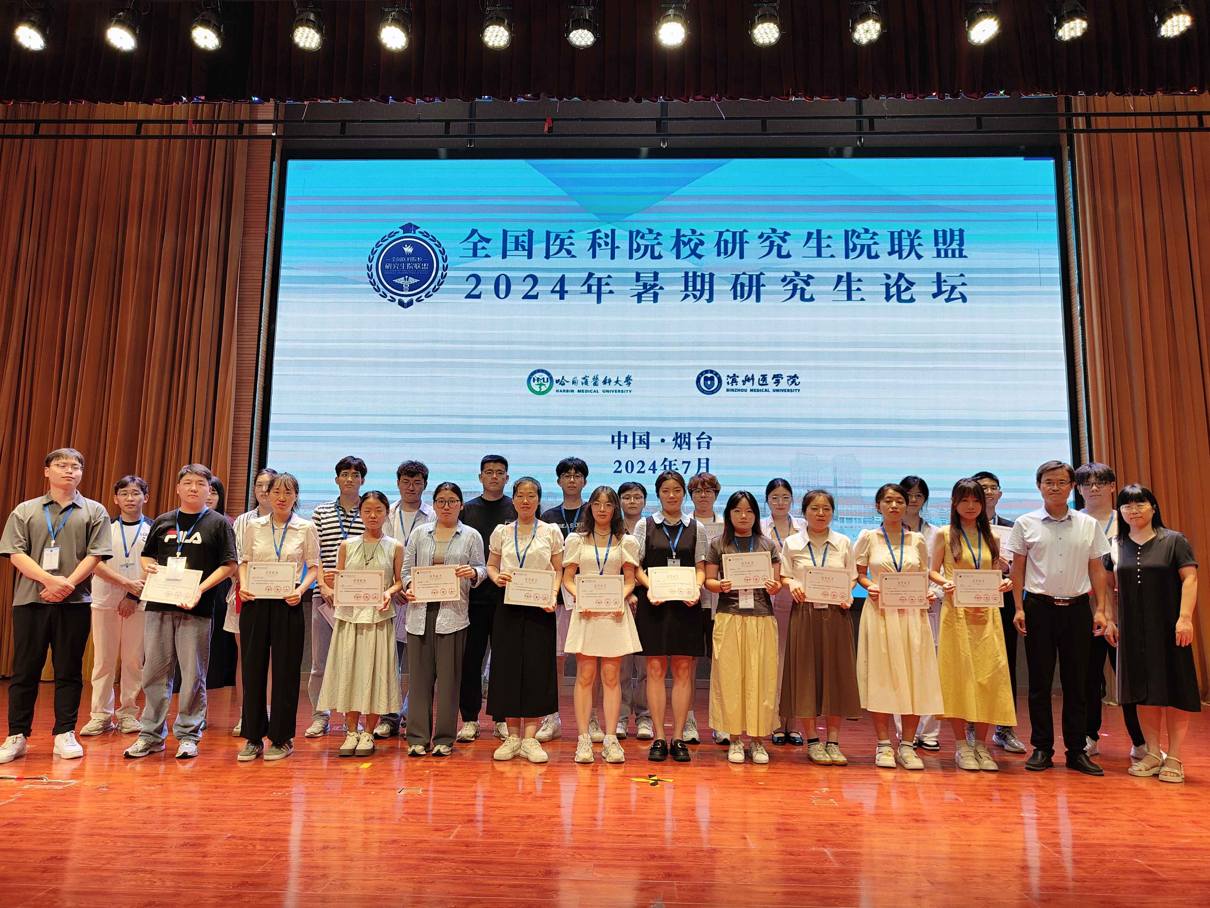 近日,由全国医科院校研究生院联盟主办,哈尔滨医科大学、滨州医学院共同承办的“2024年暑期研究生论坛”在滨州医学院烟台校区举行。我校研究生在该论坛共收获一二三等奖和优胜奖24项。