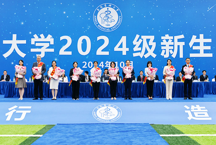 国家级人才称号获得者、国家重点研发计划首席科学家、炎症免疫性疾病安徽省实验室执行主任、校科技产业处处长王华教授,携4名新老生代表,带领2024级全体新生郑重诵读医学生誓词。