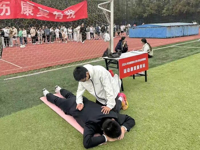 体测现场还设置康复服务站,人文医学学院2023级运动康复专业学生结合专业所学,帮助测试学生缓解体测后可能出现的肌肉疲劳、紧张或轻微损伤,为测试工作的顺利开展提供了重要保障,成为今年体测工作的新亮点。