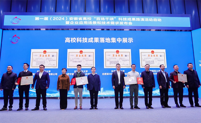 12月18日,第一届安徽省高校“百场千项”科技成果路演活动启动仪式暨企业应用场景和技术需求发布会在安徽创新馆举行。安徽省副省长任清华等领导出席活动。校学术副校长张智出席活动,并为学校成果赋权落地的团队代表颁发“成果转化之星”荣誉证书。