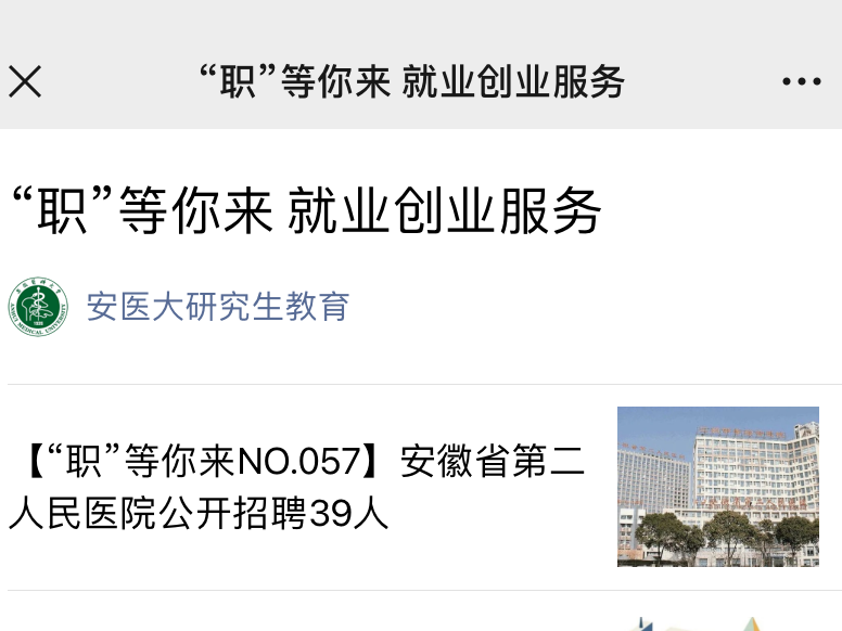 “每天刷公众号就能看到专业对口的岗位,省去了海量筛选的时间。”正在求职的第一临床医学院(第一附属医院)李同学,对“安医大研究生教育”微信公众号的“职等你来”专栏赞不绝口。该专栏通过大数据筛选、院系推荐、用人单位直通三重保障机制,广泛搜集专业对口招聘信息,目前累计发布精准招聘信息100余条,单条推文最高点击量突破5000+。