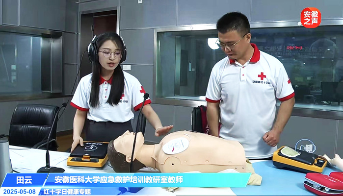 5月8日,第78个“世界红十字日”到来之际,受安徽省红十字会邀请,我校教务处(实验教学中心)应急救护培训教研室教师田云走进安徽广播电视台《健康生活家》节目直播间,面向全省听众普及应急救护知识与技能,解读科技进步对急救教育普及的深刻影响,以实际行动践行“人道、博爱、奉献”的红十字精神。