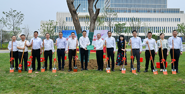 挥锹填土、引水浇灌、覆土固定……在新医科中心图书馆西侧的草坪上,校领导班子共同种下了承载着对学校未来美好期许、寓意“传承百年安医精神”的香樟,王琦、翁建平一同为树木挂牌。